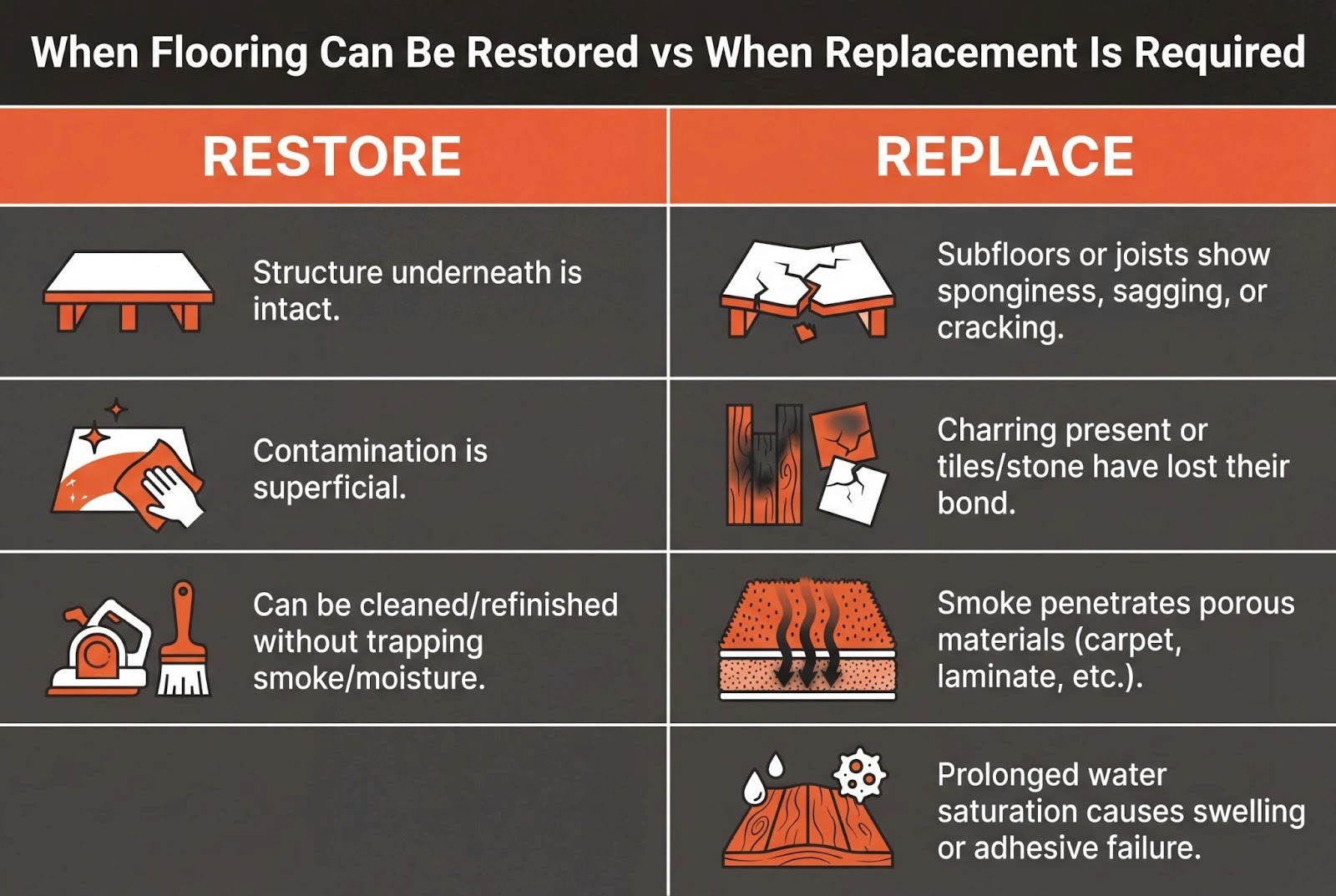 Only if contaminated materials and affected subfloors are fully removed or sealed. Odors often return when soot remains trapped below new finishes.