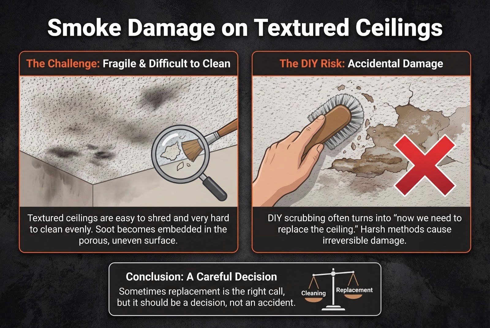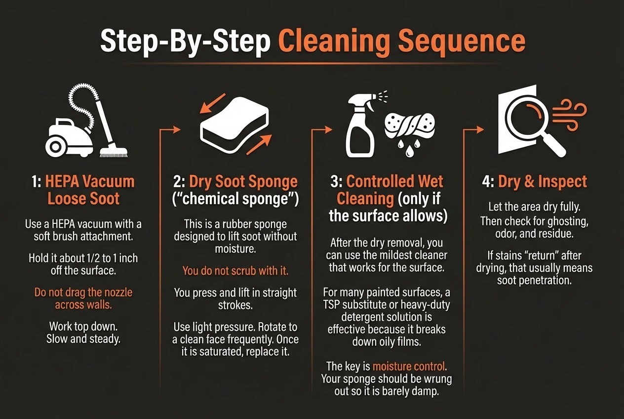 Dry removal always comes first. Moisture is used sparingly, only on the right surfaces. Paint type, wall material, ceilings, fabrics, and even electronics all behave differently once soot is disturbed.