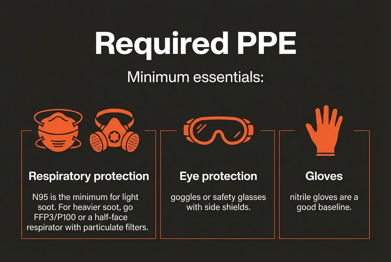 If the soot is heavier or you are working overhead, disposable coveralls (Tyvek-style), long sleeves, and shoe covers are worth it. Soot tracks everywhere.