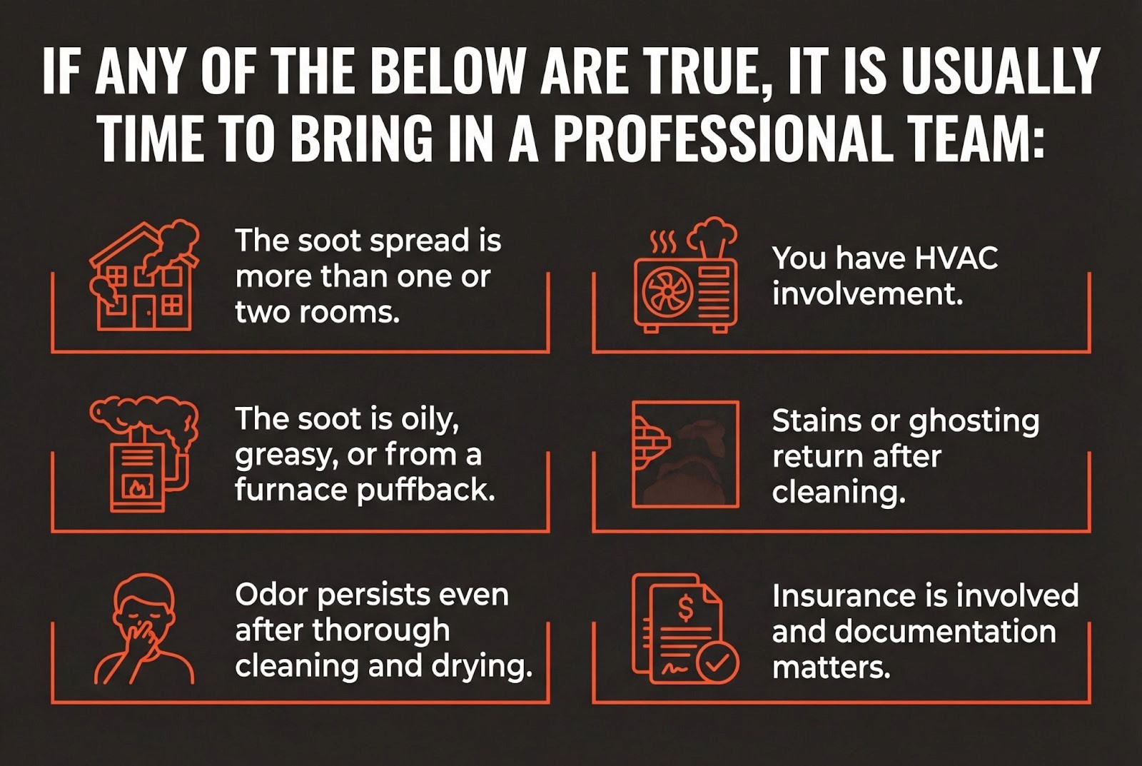 If you are not sure whether your situation is DIY-cleanable, that is a normal question. The risk with soot is not just the mess, but what the mess turns into when it is pushed deeper.