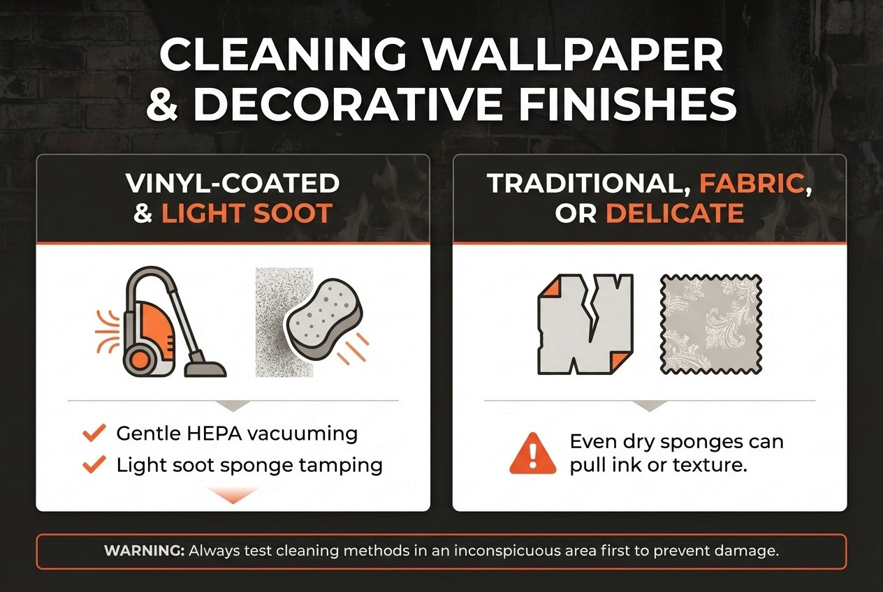 Walls, ceilings, fabrics, masonry, and electronics each require different soot-cleaning methods and limits.